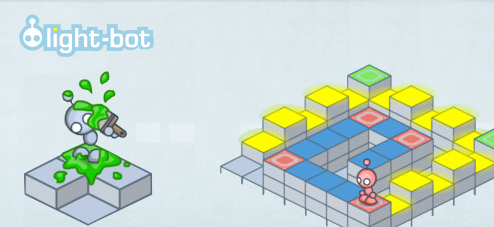 - Light-Bot .- En este juego online hay que manejar un robot y mediante sencillas órdenes de avanzar, girar, saltar, o encender tienes que guiarlo para que vaya encendiendo unas baldosas determinadas. A medida que se van superando niveles, como es lógico, se va complicando el juego y será necesario utilizar funciones, bucles y recursividad para que el robot logre encender todas las luces y pasar así al siguiente nivel.