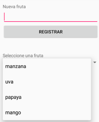 public class MainActivity extends Activity implements AdapterView.OnItemSelectedListener { private Button btnAgregar; private TextView txtAgregar; private Spinner spinnerfruta; // array para listar las frutas private ArrayList<Frutas> frutasList; ProgressDialog pDialog; // API urls // Url creacion de nuevas frutas private String URL_NEW_FRUTA = "http://192.168.1.33:8080/blog/spinner/agregar.php"; // Url listar las frutas private String URL_LISTA_FRUTA = "http://192.168.1.33:8080/blog/spinner/listar.php"; @Override protected void onCreate(Bundle savedInstanceState) { super.onCreate(savedInstanceState); setContentView(R.layout.activity_main); btnAgregar = (Button) findViewById(R.id.btnNuevaFruta); spinnerfruta = (Spinner) findViewById(R.id.spinfruta); txtAgregar = (TextView) findViewById(R.id.txtFruta); frutasList = new ArrayList<Frutas>(); // seleccionar las frutas del spinner spinnerfruta.setOnItemSelectedListener(this); btnAgregar.setOnClickListener(new View.OnClickListener() { @Override public void onClick(View v) { if (txtAgregar.getText().toString().trim().length() > 0) { String nuevaFruta = txtAgregar.getText().toString(); new AddNuevafruta().execute(nuevaFruta); } else { Toast.makeText(getApplicationContext(), "por favor ingrese nombre de la fruta", Toast.LENGTH_SHORT) .show(); } } }); new Getfrutas().execute(); } private void populateSpinner() { List<String> lables = new ArrayList<String>(); txtAgregar.setText(""); for (int i = 0; i < frutasList.size(); i++) { lables.add(frutasList.get(i).getName()); } ArrayAdapter<String> spinnerAdapter = new ArrayAdapter<String>(this, android.R.layout.simple_spinner_item, lables); spinnerAdapter .setDropDownViewResource(android.R.layout.simple_spinner_dropdown_item); spinnerfruta.setAdapter(spinnerAdapter); } private class Getfrutas extends AsyncTask<Void, Void, Void> { @Override protected void onPreExecute() { super.onPreExecute(); pDialog = new ProgressDialog(MainActivity.this); pDialog.setMessage("Obtencion de las frutas.."); pDialog.setCancelable(false); pDialog.show(); } @Override protected Void doInBackground(Void... arg0) { ServiceHandler jsonParser = new ServiceHandler(); String json = jsonParser.makeServiceCall(URL_LISTA_FRUTA, ServiceHandler.GET); Log.e("Response: ", "> " + json); if (json != null) { try { JSONObject jsonObj = new JSONObject(json); if (jsonObj != null) { JSONArray frutas = jsonObj .getJSONArray("frutas"); for (int i = 0; i < frutas.length(); i++) { JSONObject catObj = (JSONObject) frutas.get(i); Frutas cat = new Frutas(catObj.getInt("id"), catObj.getString("nombre")); frutasList.add(cat); } } } catch (JSONException e) { e.printStackTrace(); } } else { Log.e("JSON Data", "¿No ha recibido ningún dato desde el servidor!"); } return null; } @Override protected void onPostExecute(Void result) { super.onPostExecute(result); if (pDialog.isShowing()) pDialog.dismiss(); populateSpinner(); } } private class AddNuevafruta extends AsyncTask<String, Void, Void> { boolean nuevaFrutaCreada = false; @Override protected void onPreExecute() { super.onPreExecute(); pDialog = new ProgressDialog(MainActivity.this); pDialog.setMessage("creación de la nueva fruta.."); pDialog.setCancelable(false); pDialog.show(); } @Override protected Void doInBackground(String... arg) { String newFruta = arg[0]; List<NameValuePair> params = new ArrayList<NameValuePair>(); params.add(new BasicNameValuePair("nombre", newFruta)); ServiceHandler serviceClient = new ServiceHandler(); String json = serviceClient.makeServiceCall(URL_NEW_FRUTA, ServiceHandler.POST, params); Log.d("Create Response: ", "> " + json); if (json != null) { try { JSONObject jsonObj = new JSONObject(json); boolean error = jsonObj.getBoolean("error"); if (!error) { nuevaFrutaCreada = true; } else { Log.e("Error en la creacion: ", "> " + jsonObj.getString("message")); } } catch (JSONException e) { e.printStackTrace(); } } else { Log.e("JSON Data", "No ha recibido ningún dato desde el servidor!"); } return null; } @Override protected void onPostExecute(Void result) { super.onPostExecute(result); if (pDialog.isShowing()) pDialog.dismiss(); if (nuevaFrutaCreada) { runOnUiThread(new Runnable() { @Override public void run() { new Getfrutas().execute(); frutasList.clear(); } }); } } } public void onItemSelected(AdapterView<?> parent, View view, int position, long id) { Toast.makeText( getApplicationContext(), parent.getItemAtPosition(position).toString() + " Seleccionado" , Toast.LENGTH_LONG).show(); } public void onNothingSelected(AdapterView<?> arg0) { } }