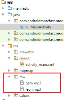 También debemos crear una carpeta llamada raw dentro de la carpeta res y poner los sonidos que deseamos insertar a nuestra aplicación en mi caso sera de un gato y un león.