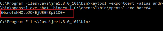 keytool -exportcert -alias androiddebugkey -keystore androiddebugkey | C:opensslbinopenssl.exe sha1 -binary | C:opensslbinopenssl.exe base64