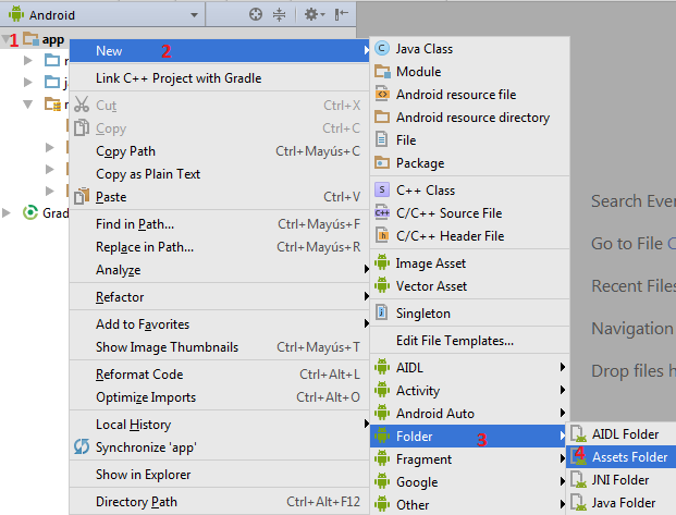 Ahora debemos hacer anticlic en app luego New nos vamos hasta Folder y clic en Assets Folder