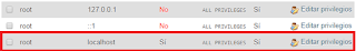 Luego al usuario root que pertenece al localhost hay que darle en editar privilegios